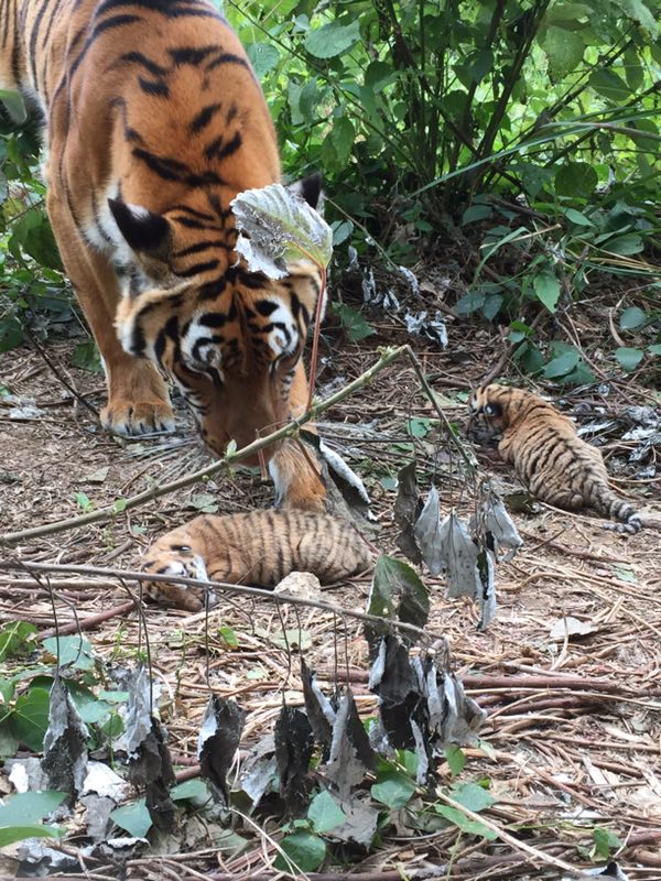 據(jù)基地科研人員介紹,本次“寶貝”喜得虎仔純屬意外!皩氊悺庇谌ツ陣(guó)慶當(dāng)天與公虎“盛盛”交配,但交配僅有一天,而且交配次數(shù)很少,質(zhì)量不高,完全沒有達(dá)到正常交配3天,交配次數(shù)上百次的要求。而且工作人員平時(shí)也沒有觀察到“寶貝”有懷孕跡象,就連產(chǎn)仔當(dāng)天早上也沒有發(fā)現(xiàn)任何預(yù)產(chǎn)行為,所以飼養(yǎng)人員照常將“寶貝”放到野外活動(dòng)區(qū)活動(dòng)。到了下午5點(diǎn)喂食時(shí)間,平日準(zhǔn)時(shí)回房進(jìn)食的“寶貝”沒有回來,然后工作人員沿著圍墻外到處尋找,結(jié)果發(fā)現(xiàn)“寶貝”帶著虎仔躺在墻腳下級(jí)虎仔哺乳,這使工作人員喜出望外。