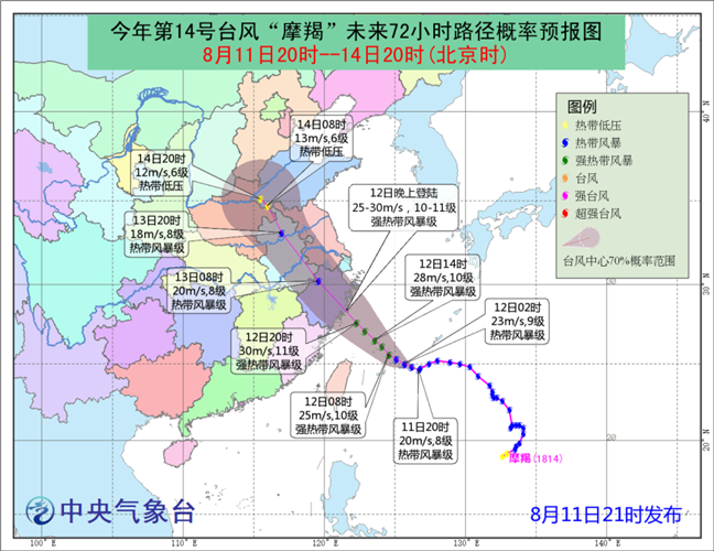今年第14號(hào)臺(tái)風(fēng)“摩羯”未來72小時(shí)路徑概率預(yù)報(bào)圖。(資料圖:來源中央氣象臺(tái)官網(wǎng))
