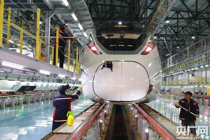 作業(yè)人員正在給“紅眼動車”做“面部”清潔(央廣網(wǎng)發(fā) 通訊員李國建 攝)
