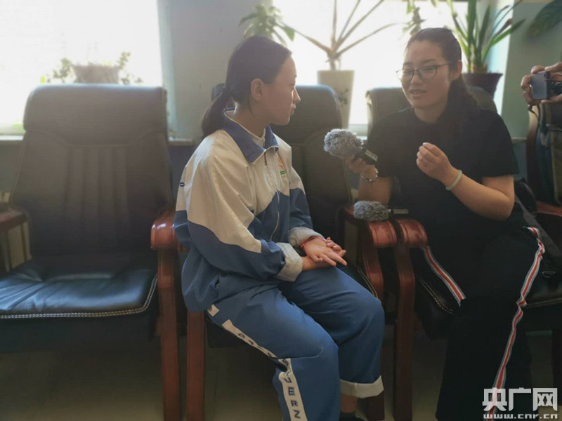 央廣網(wǎng)記者喬仁慧正在采訪準(zhǔn)備乘坐高考專列的考生(央廣網(wǎng)記者 馮志遠(yuǎn) 攝)