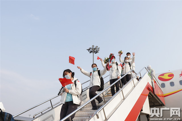 天津醫(yī)療隊成員走下飛機(央廣網(wǎng)記者 褚夫晴 攝)