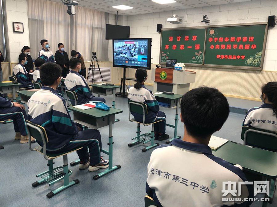九年級(jí)三班的教室里,同學(xué)們正與紅橋區(qū)對(duì)口支援地區(qū)的甘肅合水縣的學(xué)生老師一起在線視頻開(kāi)課,復(fù)課歸來(lái)如何迎接高考是他們對(duì)話(huà)的主題。兩地同上開(kāi)學(xué)第一課,共享優(yōu)質(zhì)教育資源,紅橋區(qū)教育部門(mén)還把該區(qū)教育進(jìn)修學(xué)校編寫(xiě)的2020年中高考的168個(gè)微講解和240份限時(shí)訓(xùn)練送給了甘肅合水的考生們。天津市紅橋區(qū)教育局局長(zhǎng)袁濱渤說(shuō):“在防控疫情期間,我們獲得的這些教學(xué)的經(jīng)驗(yàn),都毫無(wú)保留的傳遞給合水、碌曲的老師們。教育教學(xué)質(zhì)量不能因疫情的防控而下降。我們的扶貧工作也不能因?yàn)橐咔槎袛。今天是開(kāi)學(xué)的第一天,我們看到了學(xué)生們走進(jìn)了學(xué)校,甘肅的孩子們能夠跟我們的孩子們同上一節(jié)課,我們非常欣慰!