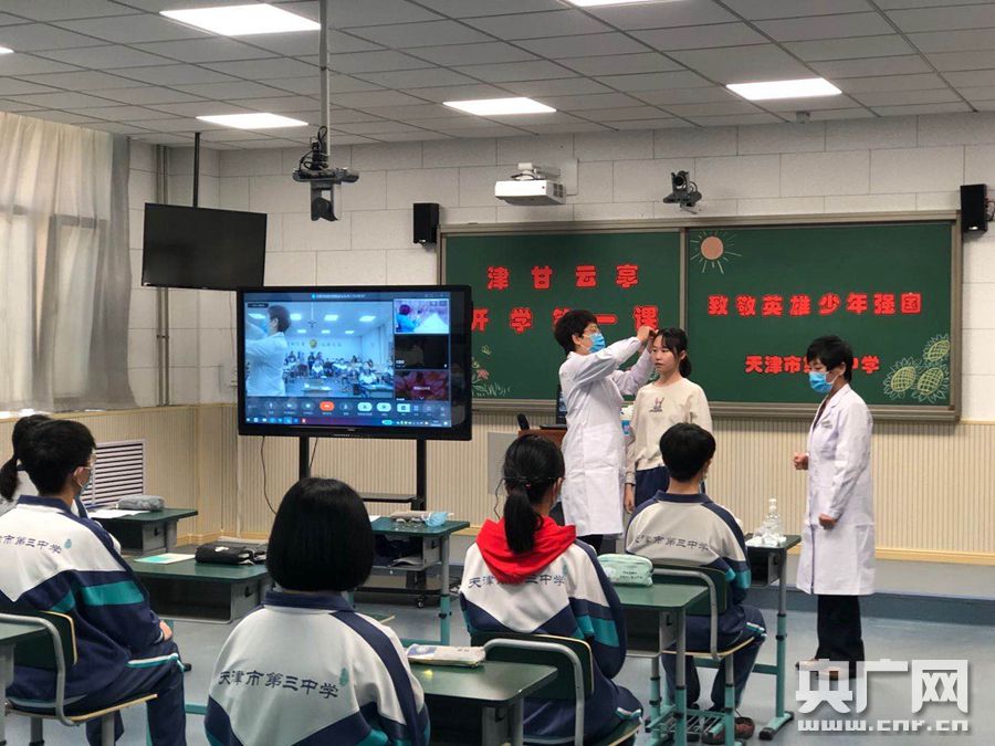 一線醫(yī)務(wù)人員為天津三中學(xué)生講解抗議知識(shí)(央廣網(wǎng)記者 夏震宇 攝)