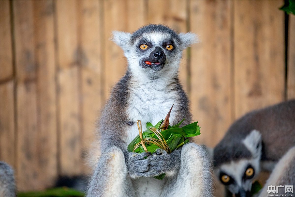 黃猩猩、山魈和節(jié)尾狐猴等靈長(zhǎng)類動(dòng)物的粽子里主要是蘋果、圣女果、香蕉、胡蘿卜、紅棗等蔬果,只見它們都非常靈活地剝開粽子,享受這頓端午節(jié)蔬果大餐。