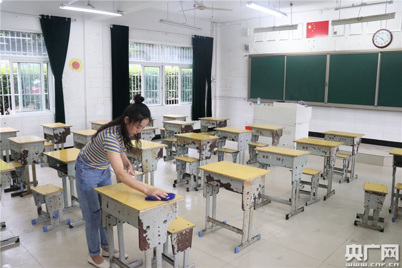 工作人員正在考場內(nèi)用消毒水擦拭桌面。(央廣網(wǎng)記者徐鵬 趙家慧 攝)