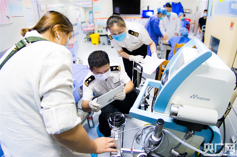 廣州海關(guān)所屬越秀海關(guān)關(guān)員對體外膜肺氧合設(shè)備進(jìn)行查驗(yàn)(央廣網(wǎng)發(fā) 方健明 攝)