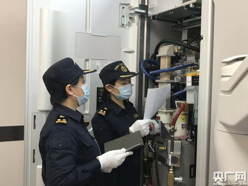 廣州海關(guān)所屬番禺海關(guān)關(guān)員對進(jìn)口醫(yī)用直線加速器進(jìn)行查驗(yàn)(央廣網(wǎng)發(fā) 陳俊鋒 攝)