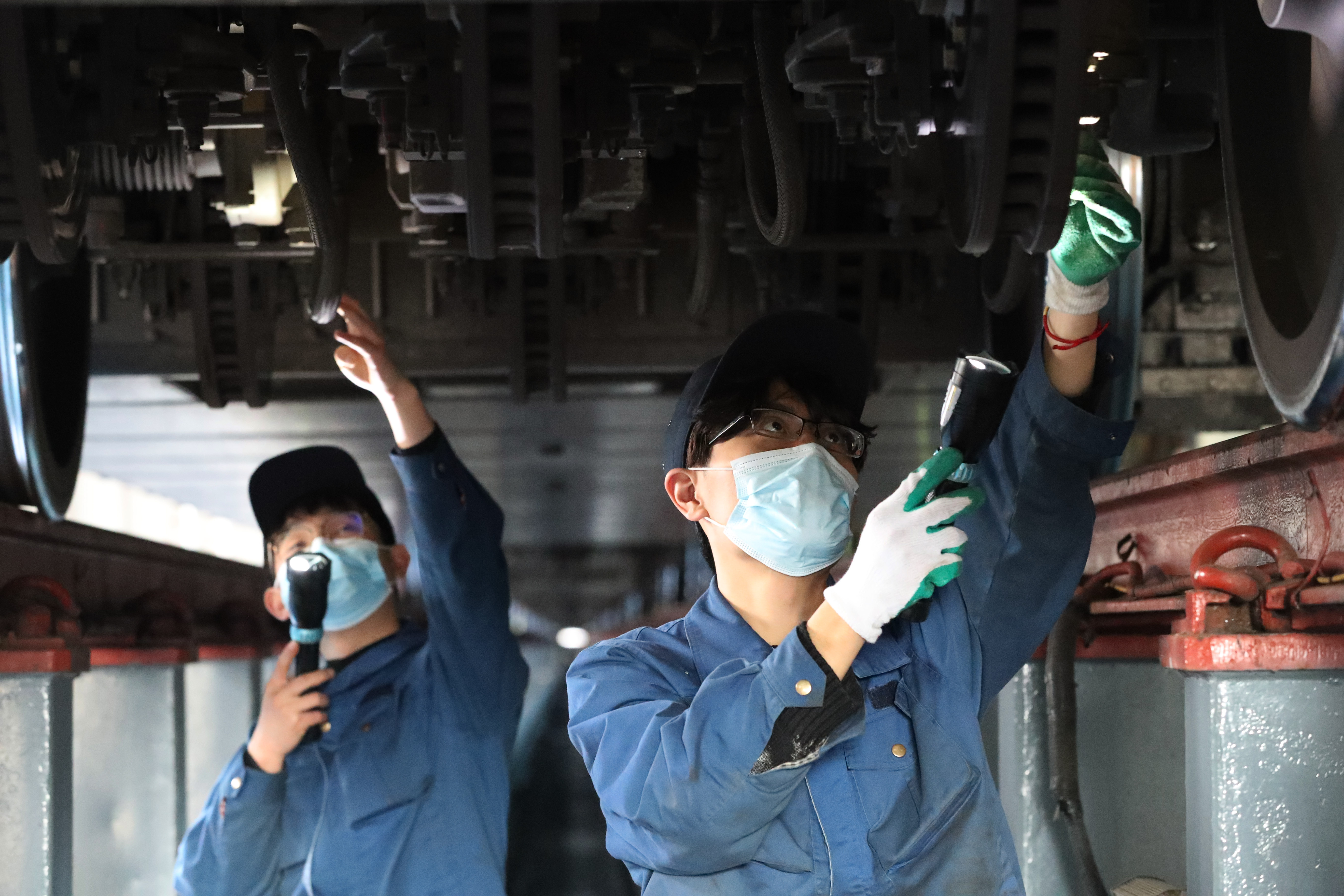 青島動(dòng)車(chē)段的工作人員在對(duì)“復(fù)興號(hào)”動(dòng)車(chē)組進(jìn)行檢修(央廣網(wǎng)發(fā) 張進(jìn)剛攝)