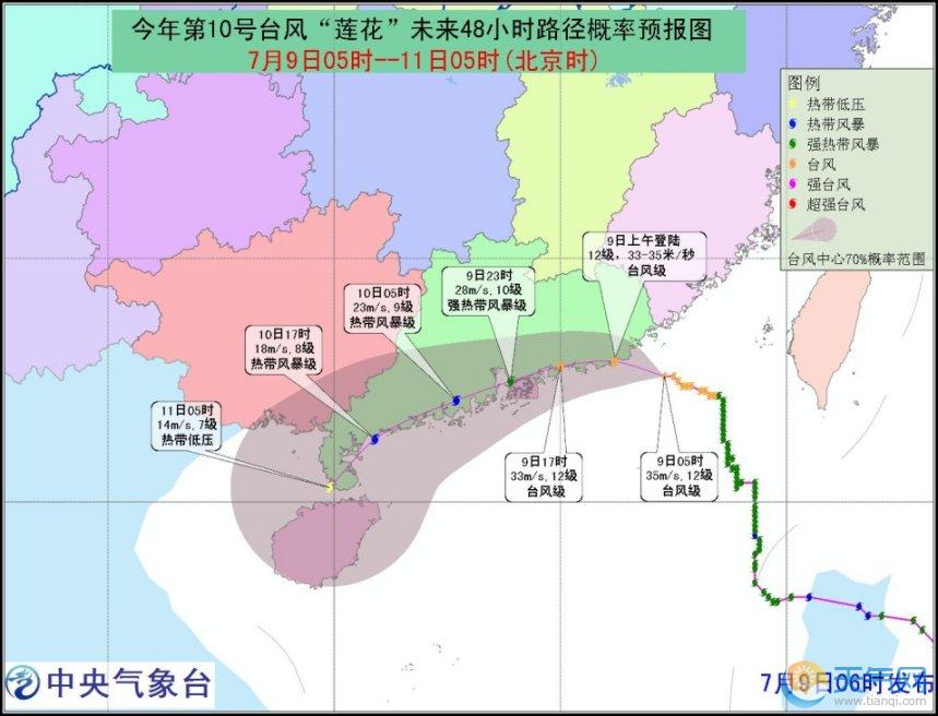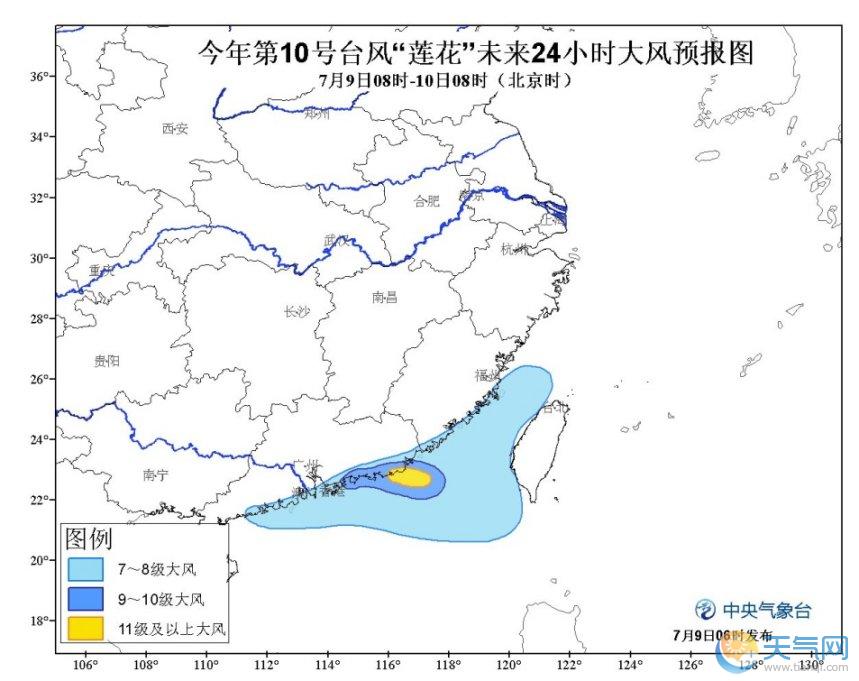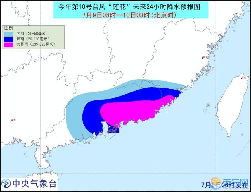 7月9日08時(shí)至7月10日08時(shí),內(nèi)蒙古東部、四川盆地西北部、川西高原南部、云南中西部、湖北東部、江西南部、福建南部、廣東、臺(tái)灣等地的部分地區(qū)有中到大雨,其中,廣東東部、福建東南部、臺(tái)灣北部的部分地區(qū)有暴雨或大暴雨(100~220毫米),上述局地將伴有短時(shí)雷暴大風(fēng)等強(qiáng)對(duì)流天氣。南海東北部有7~9級(jí)大風(fēng),“蓮花”中心經(jīng)過(guò)的附近海域風(fēng)力10~12級(jí)、陣風(fēng)13~14級(jí)。