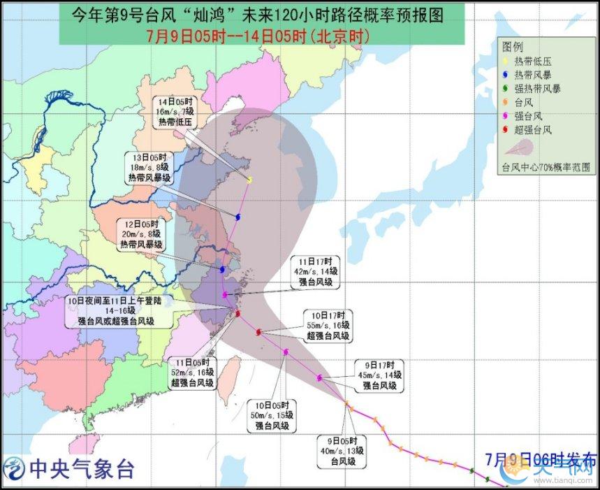 預(yù)計(jì),“燦鴻”將以每小時(shí)20公里左右的速度向西偏北方向移動(dòng),強(qiáng)度繼續(xù)加強(qiáng),將于10日白天進(jìn)入東海東南部海面,最強(qiáng)可達(dá)超強(qiáng)臺(tái)風(fēng)級(jí)(16-17級(jí),52-58米/秒) ,然后逐漸向浙閩一帶沿?拷⒂锌赡苡10日夜間至11日上午登陸上述沿海地區(qū),登陸強(qiáng)度可達(dá)強(qiáng)臺(tái)風(fēng)級(jí)或超強(qiáng)臺(tái)風(fēng)級(jí)(14-16級(jí),45-52米/秒)。