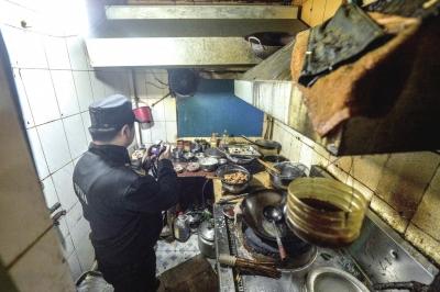 餐館后廚油膩垃圾遍布灶臺,工作人員正在拍照取證。京華時報記者趙思衡攝