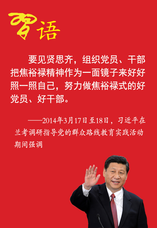 2014年3月17日至18日,習近平在蘭考調(diào)研指導黨的群眾路線教育實踐活動期間要求:“要見賢思齊,組織黨員、干部把焦裕祿精神作為一面鏡子來好好照一照自己,努力做焦裕祿式的好黨員、好干部。”