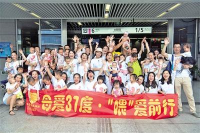 每年8月的第一周是“世界母乳喂養(yǎng)周”。昨天上午10點(diǎn),20名年輕媽媽帶著自己的寶貝,和數(shù)十名志愿者相約來(lái)到重慶軌道交通6號(hào)線黃泥塝站。