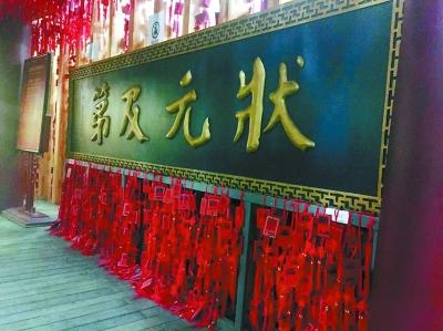密密麻麻的祈福牌幾乎遮住了“狀元及第”這塊匾額,每塊祈福牌、每句留言都是一份沉甸甸的祝愿。