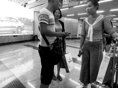 在站外收卡的人不止該男子一人,欄桿附近約有七八個(gè)人,其中還有兩名女子。有兩名拖著行李的女子走向地鐵進(jìn)站口,一名穿短袖的男子擋在兩人前方問是否要退卡,其中一名女子掏出幾張卡問他:“卡里還有余額。”“我能幫你查余額!蹦凶犹统鍪謾C(jī),將卡放在手機(jī)背后,點(diǎn)了幾下屏幕!翱ɡ锸A31元錢,加上押金20元,我一共給你41元吧?”另外一名女子說:“你少收點(diǎn)吧?”該男子說:“少收你兩塊吧,成不成?”女子點(diǎn)頭,于是男子掏錢,女子將卡給他。每一名收卡人收取的費(fèi)用不等,其中有一名女子向乘客收15元的費(fèi)用。