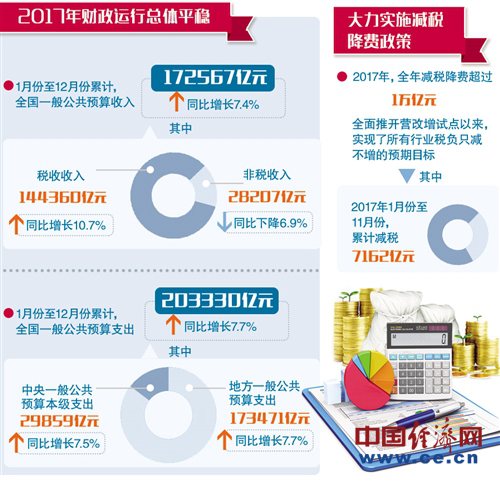 1月25日,財(cái)政部召開新聞發(fā)布會(huì)介紹2017年財(cái)政收支情況,去年財(cái)政運(yùn)行總體平穩(wěn),財(cái)政收入增速加快。據(jù)統(tǒng)計(jì),2017年全國一般公共預(yù)算收入172567億元,同比增長7.4%,其中稅收收入144360億元,同比增長10.7%;全國一般公共預(yù)算支出首次突破20萬億元。