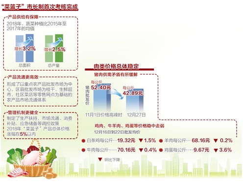 此外,“菜籃子”管理機(jī)制更健全。36個(gè)城市制定了生產(chǎn)扶持、市場(chǎng)流通、消費(fèi)補(bǔ)貼、應(yīng)急儲(chǔ)備等調(diào)控政策,2018年“菜籃子”產(chǎn)品總體價(jià)格漲幅在5%以內(nèi)。