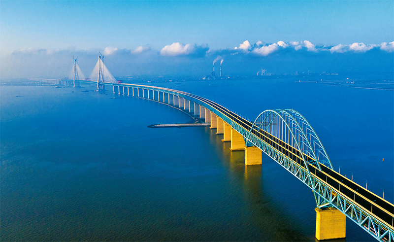 滬通長(zhǎng)江大橋連接江蘇省張家港市和南通市,是我國(guó)“八縱八橫”高鐵網(wǎng)中沿海鐵路大通道的咽喉工程,是目前世界上最大跨徑的公鐵兩用大橋。這一工程規(guī)模大、標(biāo)準(zhǔn)高、難度大,代表著當(dāng)前中國(guó)乃至世界同類型橋梁建設(shè)的最高水平。2019年9月20日,滬通長(zhǎng)江大橋成功合龍。圖為無人機(jī)拍攝的水天一色滬通長(zhǎng)江大橋全景。 人民圖片 丁曉春/攝
