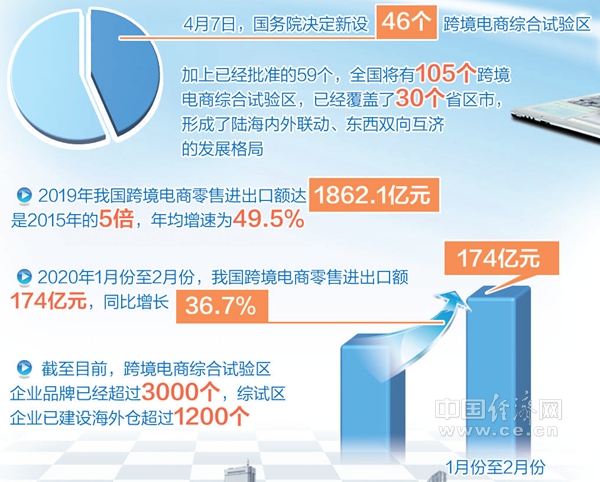 疫情發(fā)展并未影響我國跨境電商綜合試驗區(qū)再次擴(kuò)圍。4月7日,國務(wù)院決定新設(shè)46個跨境電商綜合試驗區(qū),加上已經(jīng)批準(zhǔn)的59個,全國將擁有105個跨境電商綜合試驗區(qū),已經(jīng)覆蓋了30個省區(qū)市,形成了陸海內(nèi)外聯(lián)動、東西雙向互濟(jì)的發(fā)展格局。