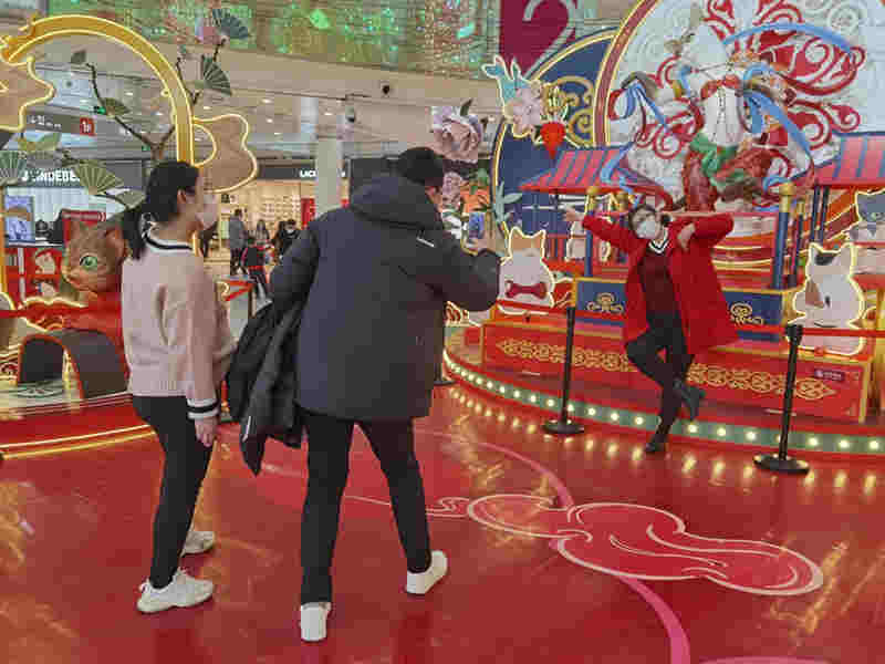春節(jié)期間,在位于北京市朝陽區(qū)雙井街道的某商場內(nèi),一家三口佩戴口罩悠閑游逛。在商場中心位置的特色展臺前,阿姨擺出跳舞的姿勢,難掩口罩下綻放的笑顏,家人趕忙用手機記錄下她的美好心情。