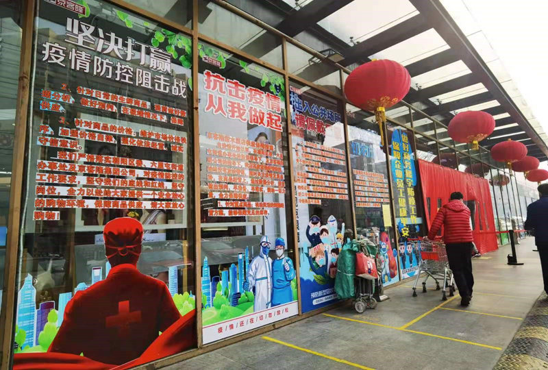 北京市朝陽區(qū)京客隆超市(甜水園店)的玻璃大門上,貼滿了“堅決打贏疫情防控阻擊戰(zhàn)”“抗擊疫情從我做起”“進入公共場所請佩戴口罩”等醒目標(biāo)語及五彩繽紛的宣傳圖片,與玻璃門上方充滿節(jié)日喜慶的大紅燈籠相映成趣。超市嚴格按照防范規(guī)定,消費者需要先掃描健康碼、測量體溫后,再有序進入超市。