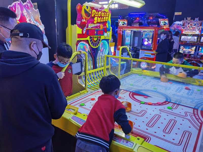 春節(jié)期間,在位于北京市朝陽區(qū)西大望路的某大型購物中心休閑娛樂區(qū),家長和孩子們均佩戴口罩,在家長的看護下,孩子們保持安全距離,玩桌面冰球不亦樂乎。