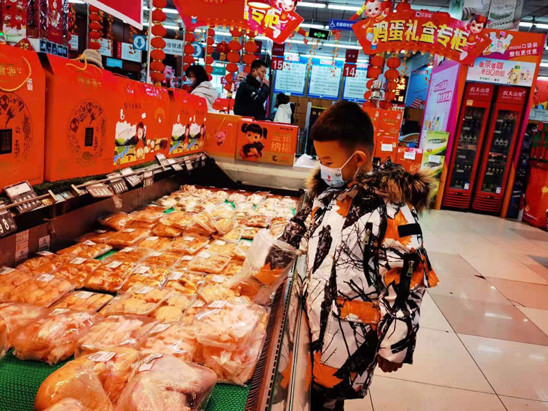 大年三十,超市內(nèi)充滿了節(jié)日的喜慶氛圍。一位小朋友手套塑料袋,正在學(xué)習(xí)如何在做好個人防護的情況下,安全購買冷鏈食品。