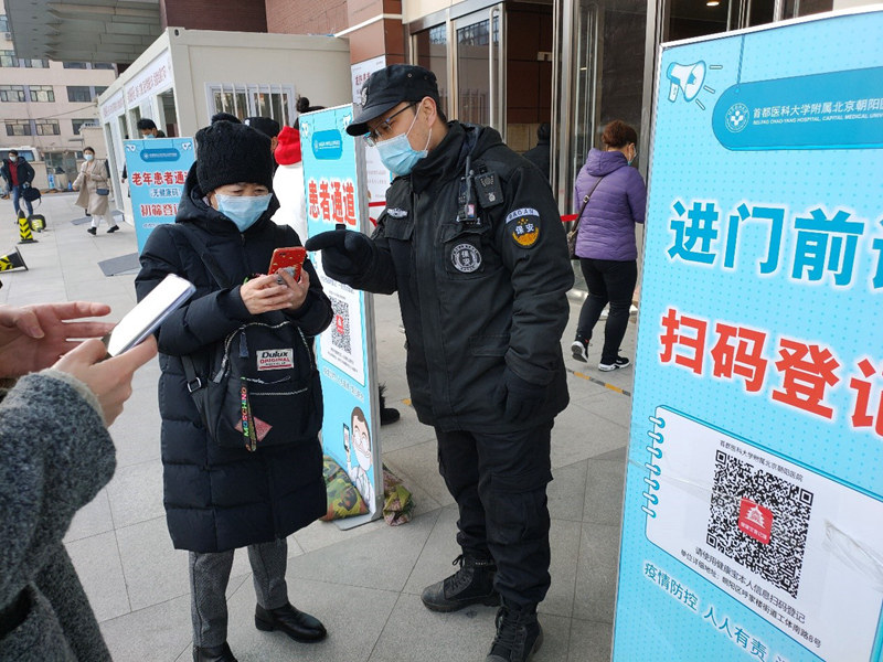春節(jié)期間,北京朝陽醫(yī)院就診患者依然很多!拔也粫弥悄苁謾C,怎么進醫(yī)院?”一名60歲左右的患者因不會使用健康碼而著急不已!鞍⒁,別急,您可以從小程序里面找到健康碼,也可以從旁邊的‘老年通道’進入醫(yī)院!痹诎脖H藛T的引導(dǎo)下,患者順利經(jīng)過體溫檢測等程序進入醫(yī)院。