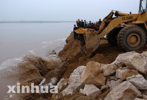 3月22日,搶險(xiǎn)人員正在加厚發(fā)生險(xiǎn)情的黃河堤壩。3月21日下午,黃河內(nèi)蒙古準(zhǔn)格爾旗李三壕河段出現(xiàn)流凌淘岸險(xiǎn)情。當(dāng)?shù)胤姥床块T(mén)動(dòng)用260多人和140余輛汽車、工程車日夜搶險(xiǎn)。目前淘岸險(xiǎn)情得到初步控制。 新華社記者 任軍川攝