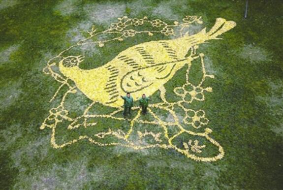 3日上午,郫都區(qū)置信逸都小區(qū)內(nèi),老何和搭檔花了近4個小時在小區(qū)中庭的大草地上“畫”出了一幅銀杏新作——臘梅花開枝頭,畫眉回眸而棲!斑要再改改,看上去全是線條!崩虾螌@幅銀杏圖不是很滿意。吃過午飯,他讓搭檔老王再去拉些銀杏葉來,“把畫眉用葉子填滿,把線條用草地本身體現(xiàn),讓它更渾然一體,更有沖擊力!