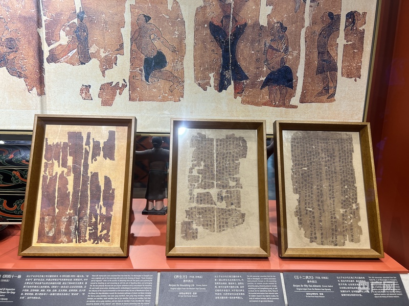 “律動(dòng)乾坤”從展現(xiàn)古人運(yùn)動(dòng)智慧的《導(dǎo)引圖》拼接圖,到《五十二病方》《養(yǎng)生方》等以養(yǎng)生保健為主題的帛書,從借展自湖南省博物館的小漆盤、長(zhǎng)方形粉彩漆奩,到上海體育大學(xué)博士生導(dǎo)師邱丕相教授研究馬王堆導(dǎo)引術(shù)時(shí)的手稿,不僅揭示了馬王堆《導(dǎo)引圖》的千年奧秘,還印證了這些古老智慧至今仍在現(xiàn)代體育、醫(yī)學(xué)和養(yǎng)生實(shí)踐中煥發(fā)活力。