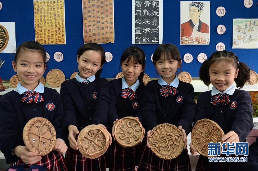 3月15日,西安市曲江第二小學(xué)學(xué)生展示自己的博物館課作業(yè)——瓦當(dāng)模型。新華社記者 李一博 攝 -