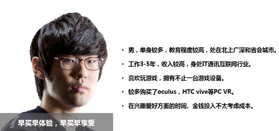 這類用戶的精力旺盛,追逐刺激體驗,大都在購買前有在各種渠道(借別人的、體驗店等)體驗過,對VR帶來的全景體驗覺得新奇,對VR游戲特別期待。猴急猴急的想自己擁有一臺VR,覺得酷斃了。這里想想自己當年想買游戲機時候急切的心情就是了。