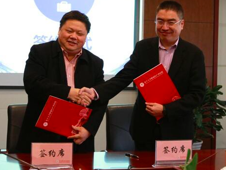 復(fù)旦大學(xué)附屬婦產(chǎn)科醫(yī)院院長徐叢劍(左)和騰訊互聯(lián)網(wǎng)+副總裁張。ㄓ遥┖炇鸷献鲄f(xié)議