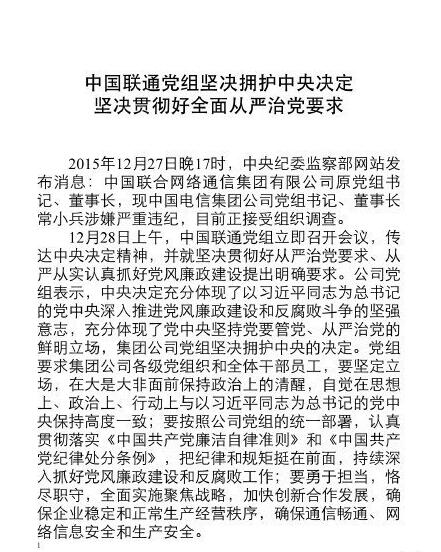 12月27日下午17點(diǎn),中紀(jì)委在官網(wǎng)宣布“中國(guó)聯(lián)合網(wǎng)絡(luò)通信集團(tuán)有限公司原黨組書記、董事長(zhǎng),現(xiàn)中國(guó)電信集團(tuán)公司黨組書記、董事長(zhǎng)常小兵涉嫌嚴(yán)重違紀(jì),目前正接受組織調(diào)查。”隨后中國(guó)電信就此發(fā)表聲明,表示堅(jiān)決支持中央的決定,堅(jiān)決抓好黨風(fēng)廉政建設(shè)。現(xiàn)在中國(guó)聯(lián)通也就此事發(fā)布聲明。