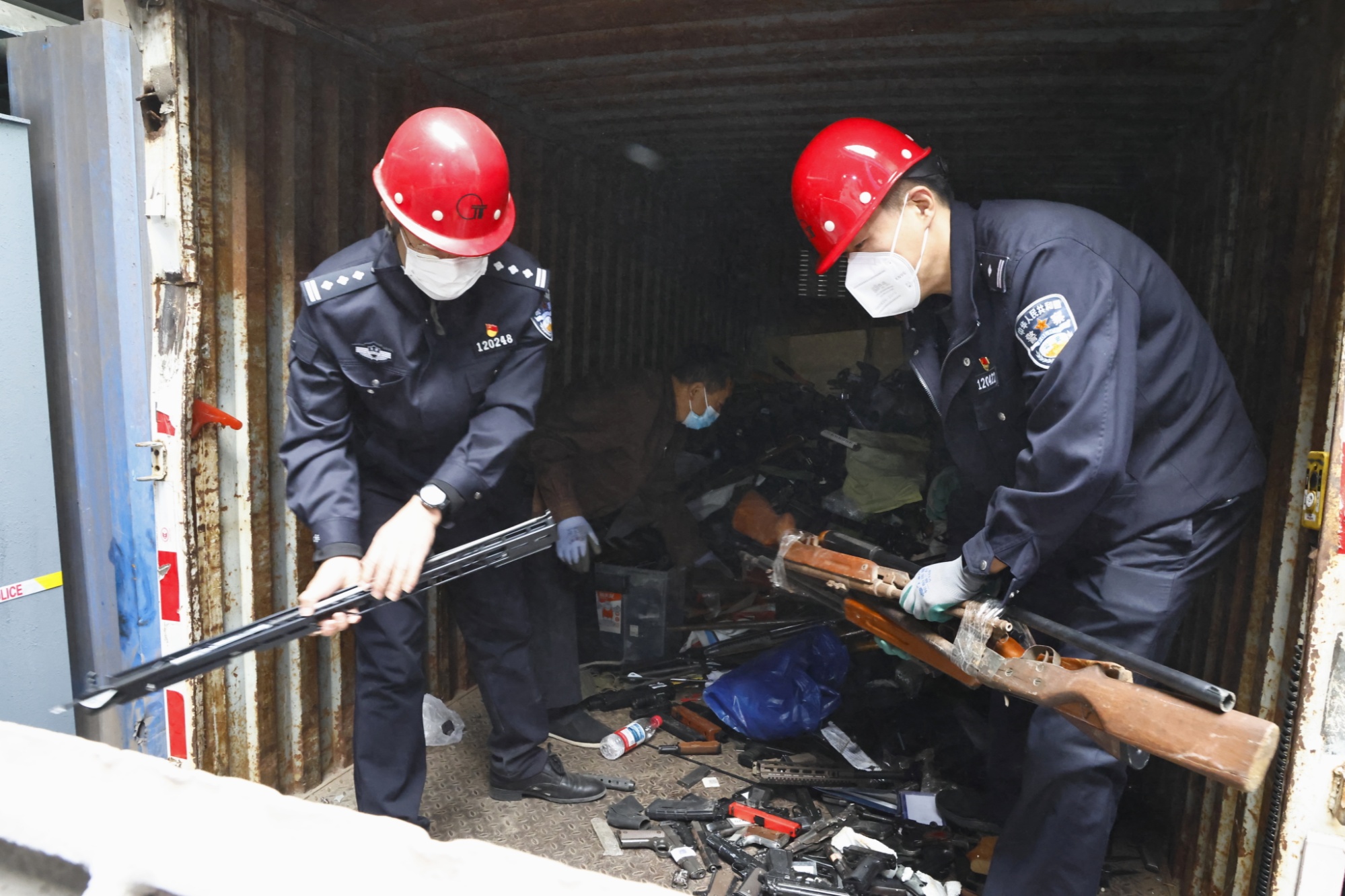 日前,天津市公安局對清查收繳的143支非法槍支和640件仿真槍、弩、管制刀具,進行集中銷毀。