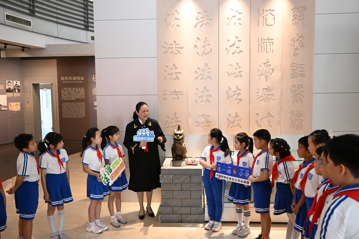 實驗小學牛秋菊老師在天津法院陳列館,以“法律是治國之重器”開課。她借獬豸銅塑解讀法治智慧,引導學生“尋找天津法治第一”,讓孩子們知曉中國近代最早法院、警察等誕生于天津;結合校園霸凌案例,教會學生拒絕暴力、守護自身權益,在心中播下法治種子。