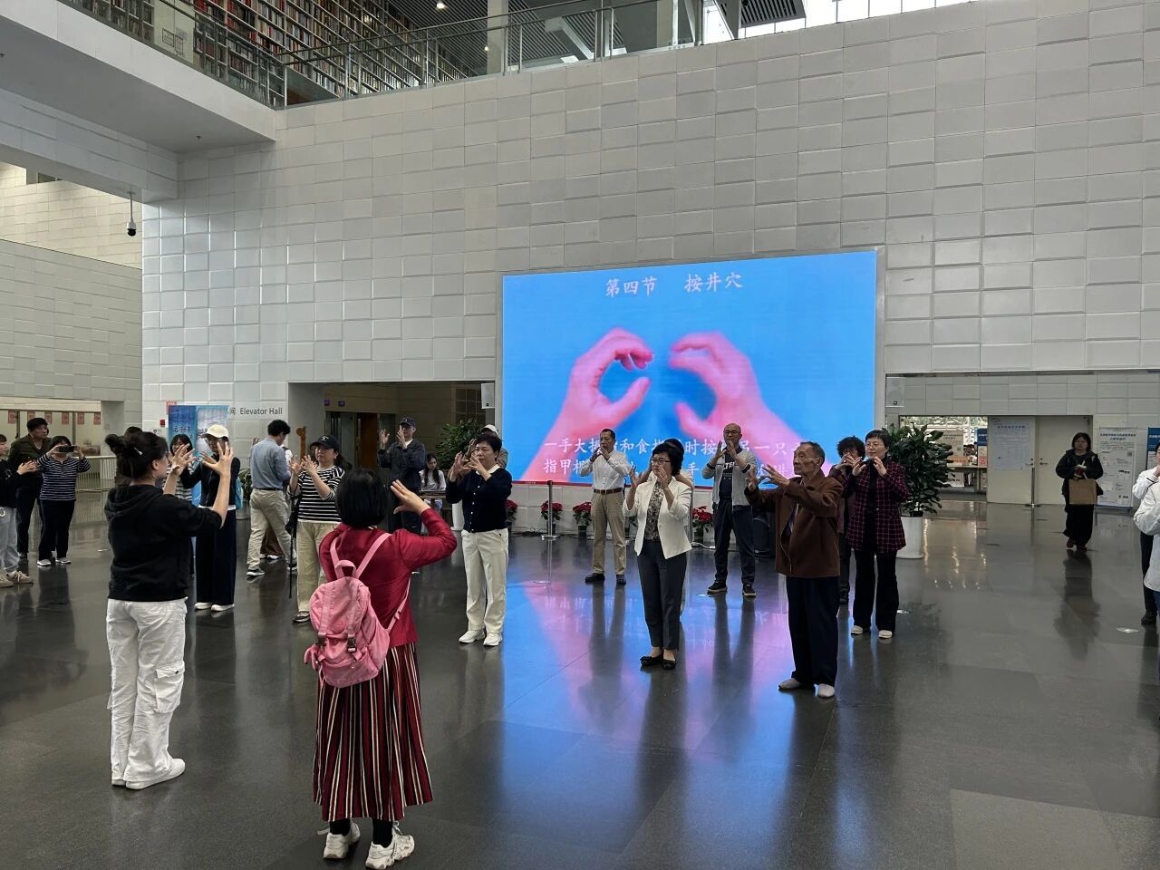 在一樓大廳,“書籍之美”課程師生與“岐黃未暖”三下鄉(xiāng)團(tuán)隊(duì)齊登場(chǎng)。教學(xué)視頻先拆解動(dòng)作,真人再示范,志愿者一對(duì)一糾正指尖角度,隨著中國音樂學(xué)院古琴專業(yè)學(xué)生張嘉煜的《高山流水》響起,讀者們齊伸指尖,經(jīng)過跟練,“手指井穴操”被現(xiàn)場(chǎng)“解鎖”。