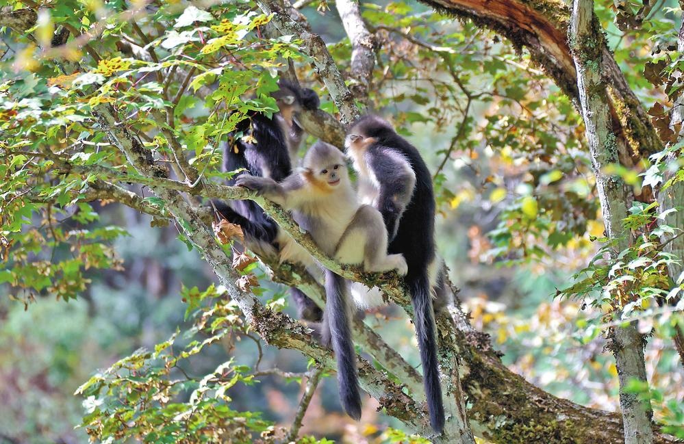 近年來,我省持續(xù)推進(jìn)滇金絲猴棲息地修復(fù)工作,通過種植云杉、冷杉等樹種,在白馬雪山國家級自然保護(hù)區(qū)等地成功構(gòu)建起連接滇金絲猴棲息地的生態(tài)廊道,滇金絲猴種群數(shù)量持續(xù)增長。目前,保護(hù)區(qū)內(nèi)的滇金絲猴種群數(shù)量已增長到約2800只,占全國的65%以上。圖為滇金絲猴在位于維西傈僳族自治縣塔城鎮(zhèn)的香格里拉滇金絲猴國家公園內(nèi)嬉戲玩耍。(記者 黃興能)