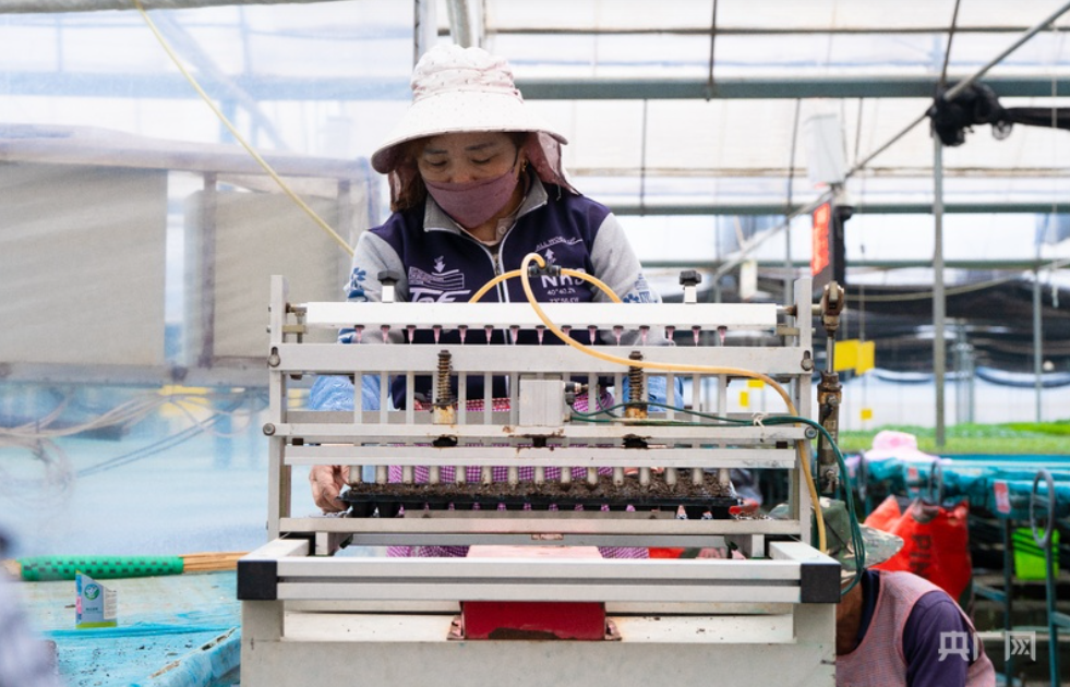 工人在元謀現(xiàn)代種業(yè)科技園育苗工廠大棚內(nèi)操作播種機器(央廣網(wǎng)發(fā) 普朝恒 攝)