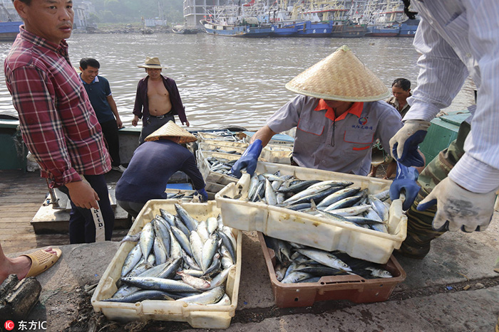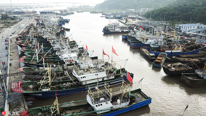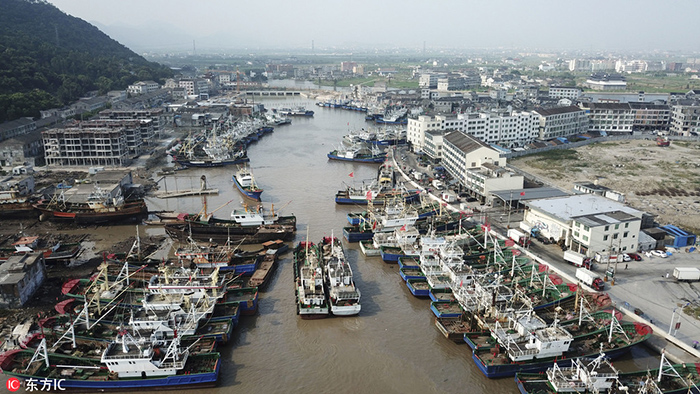 8月12日,在浙江省溫州市蒼南縣舥艚港區(qū),一艘艘漁船陸續(xù)進(jìn)入避風(fēng)港。