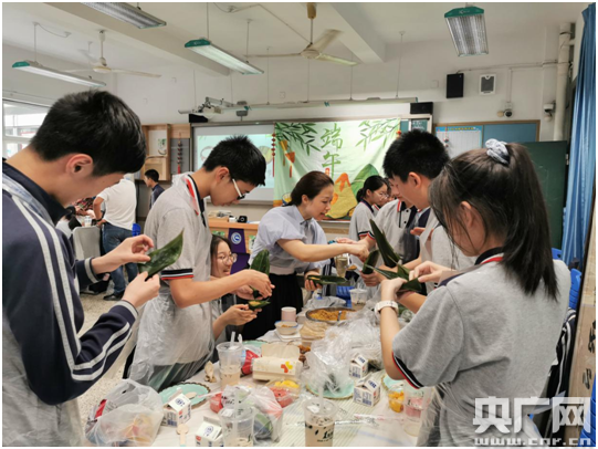 折葉、盛料、壓實、裹葉、扎繩……一雙雙忙碌的手穿梭在一張張翠綠的粽葉間,一道道工序有條不紊地進行著,一片片清香的粽葉、一粒粒晶瑩的糯米,在同學們靈巧的手中翻轉飛舞,轉眼就變成了一個個誘人的粽子。